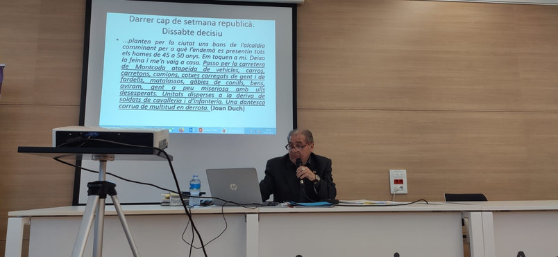 L’historiador Josep Puy va pronunciar la conferència “Terrassa 1939, derrota i exilis”. Estudiós de l’exili republicà i autor de biografies i dietaris d’exiliats, va explicar amb detall els darrers dies de la Terrassa republicana, els camins de l’exili i la sort d’alguns republicans terrassencs exiliats a partir del febrer de 1939.